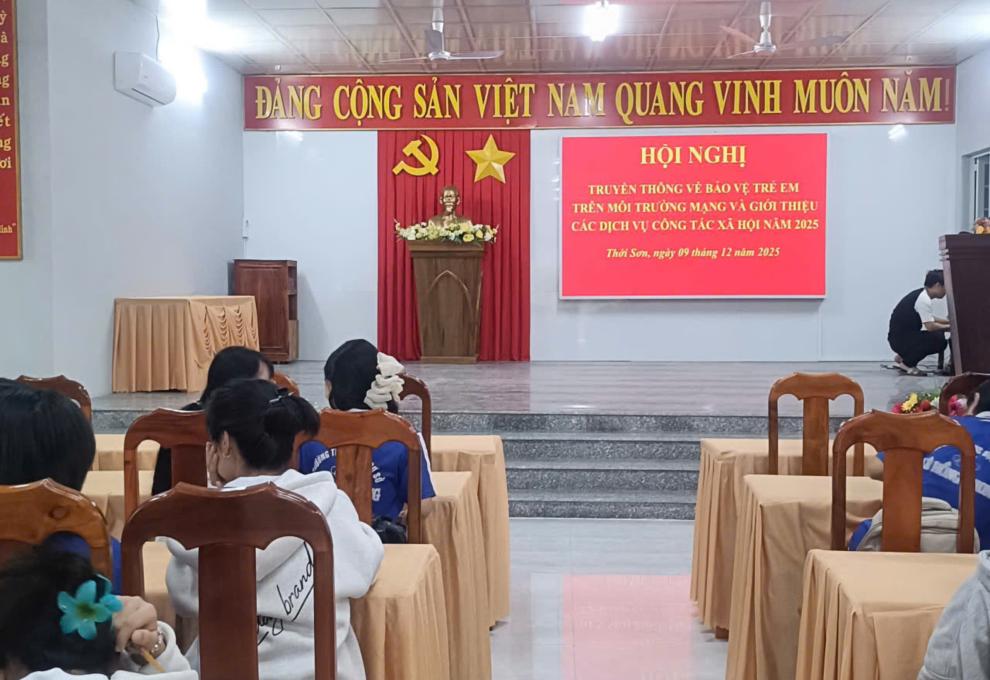 Sáng ngày 09/12/2025, phường Thới Sơn phối hợp với Trung tâm Bảo trợ xã hội An Giang tổ chức hội nghị truyền thông về bảo vệ trẻ em trên môi trường mạng. Buổi truyền thông nhằm nâng cao nhận thức cho phụ huynh và trẻ em về các nguy cơ, hình thức xâm hại, lừa đảo, bạo lực mạng và cách phòng tránh, bảo vệ thông tin cá nhân khi sử dụng Internet.