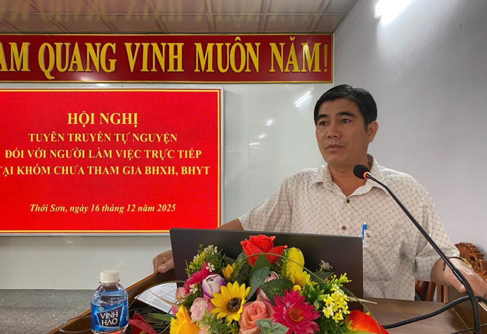Ngày 16/12/2025, UBND phường Thới Sơn phối hợp với BHXH cơ sở Châu Đốc tổ chức Hội nghị tuyên truyền chính sách bảo hiểm xã hội (BHXH) tự nguyện cho người lao động làm việc trực tiếp tại các khóm, ấp chưa tham gia BHXH, BHYT.